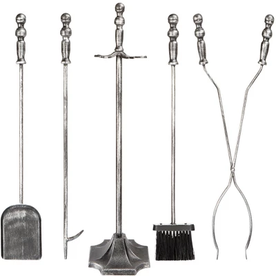 - COMPLETE 5-PIECE SET: Fireplace essentials included in this set are a dust pan, poker, set of tongs, sweeping brush, and a stand to conveniently hold them all